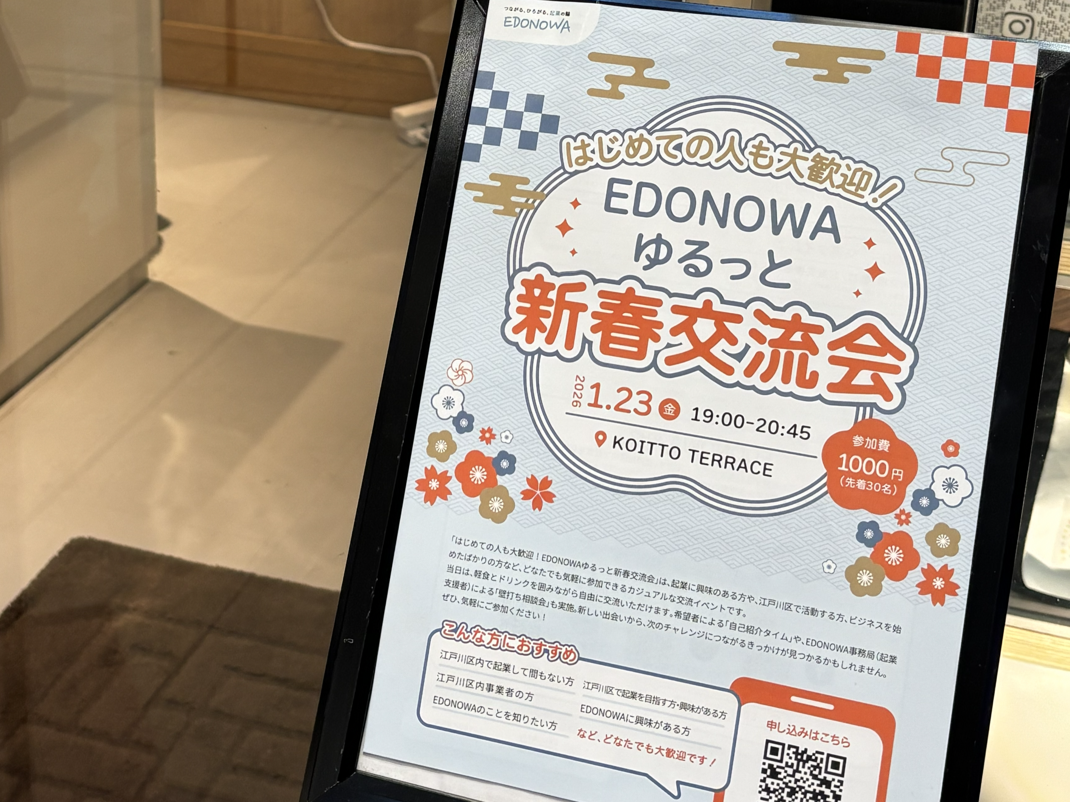 EDONOWAでは、1月23日(金)に「はじめての人も大歓迎!EDONOWAゆるっと新春交流会」を開催しました。本イベントは、起業に興味のある方や江戸川区で活動する方、ビジネスを始めたばかりの方などを対象に、気軽に参加できるカジュアルな交流の機会です。会場となったJR小岩駅にある街のコミュニティスペース・KOITTO TERRACE(コイットテラス)へ、多くの方が足を運んだ一夜を振り返ります。