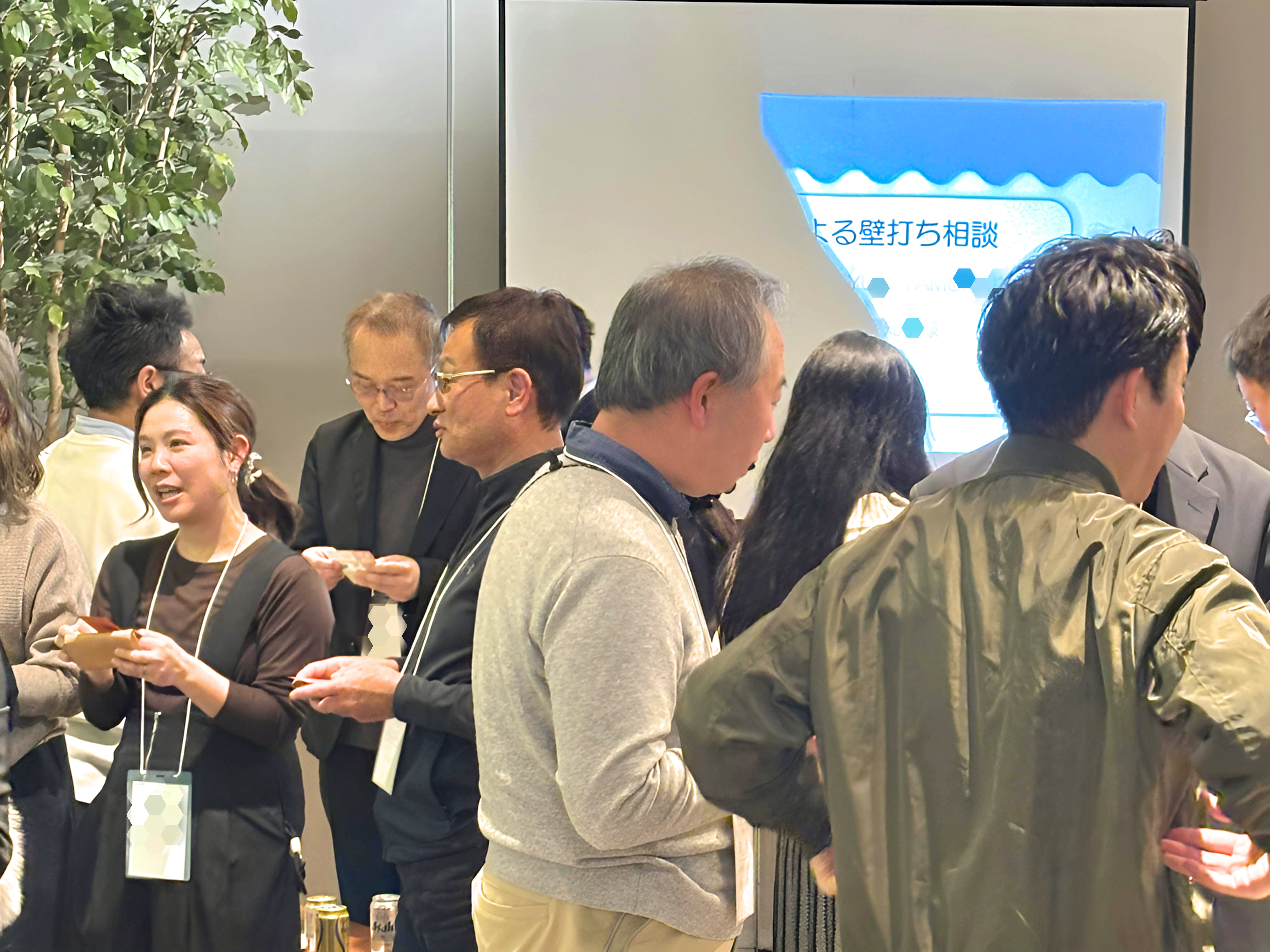 寒さが染みる外気と対照的に、コイットテラスは盛況でした。この日は、仕事終わりの方も多かった中、定刻を迎えるころには参加者の皆さんが勢ぞろい。イベントに対する期待や関心の高さを感じました。EDONOWAのイベントとして初めて“乾杯”の音頭とともに交流会がスタート。初参加の方も多い状況でしたが、飲み物や軽食を片手に少しずつ会話が広がっていきます。