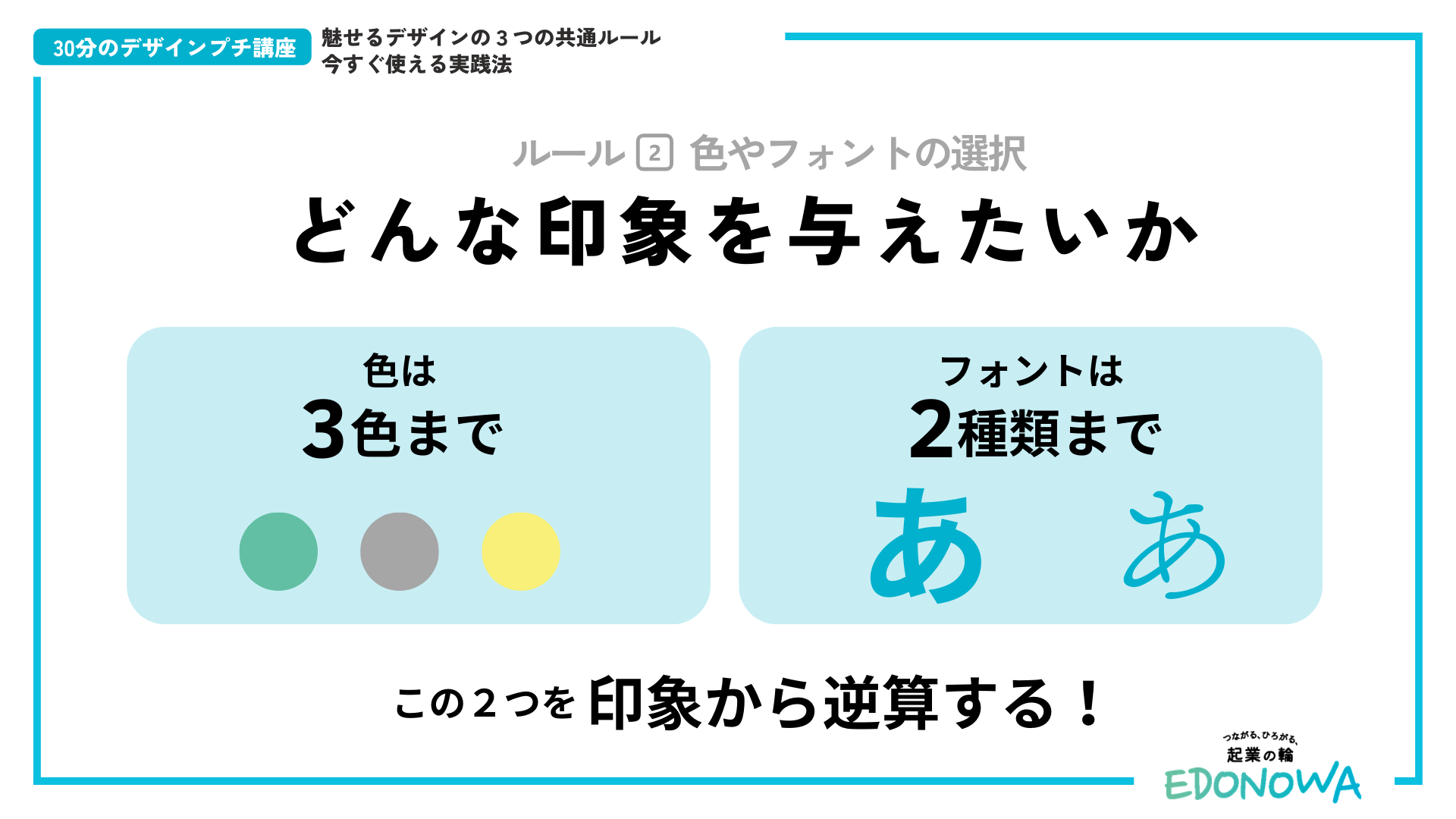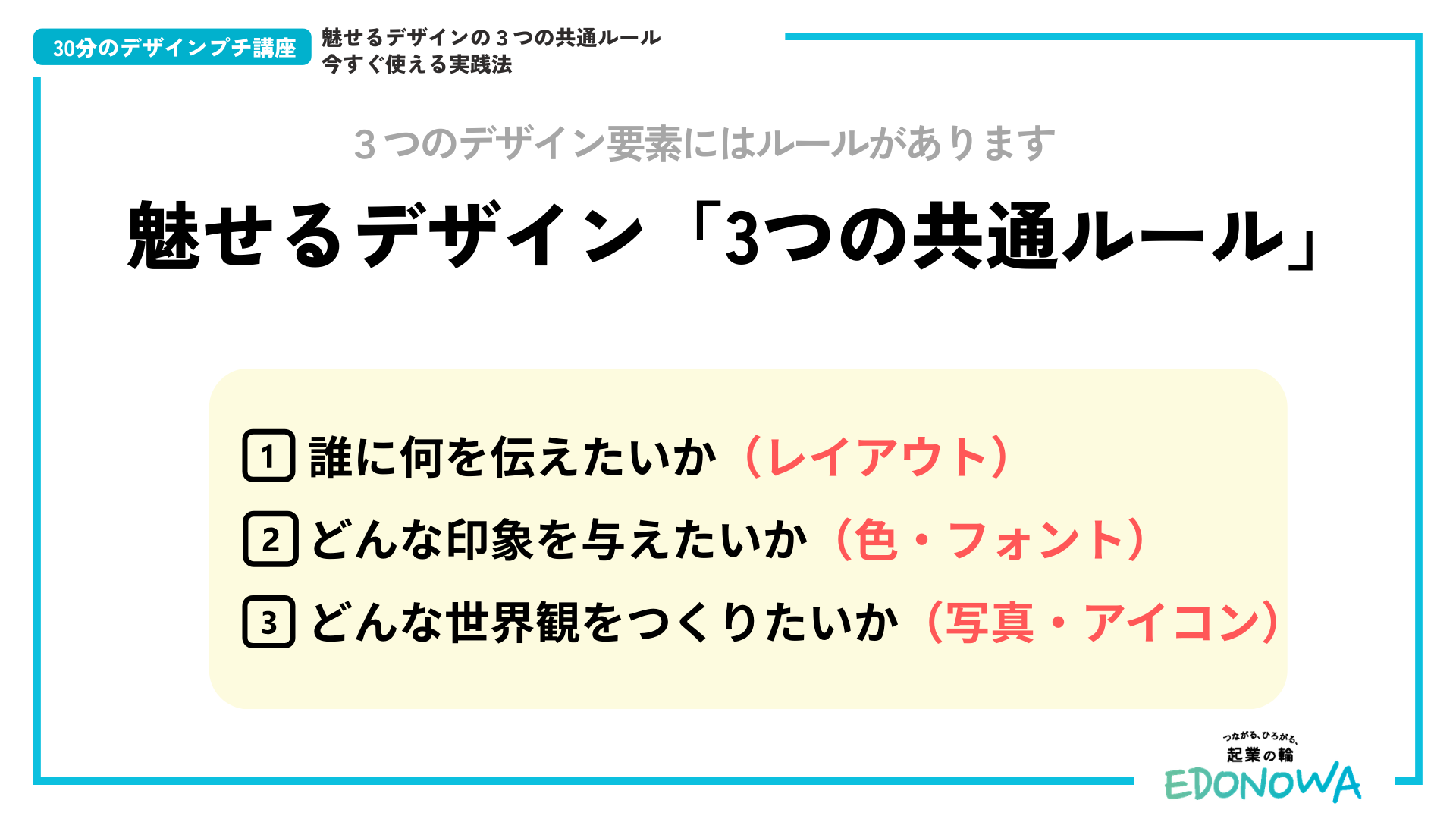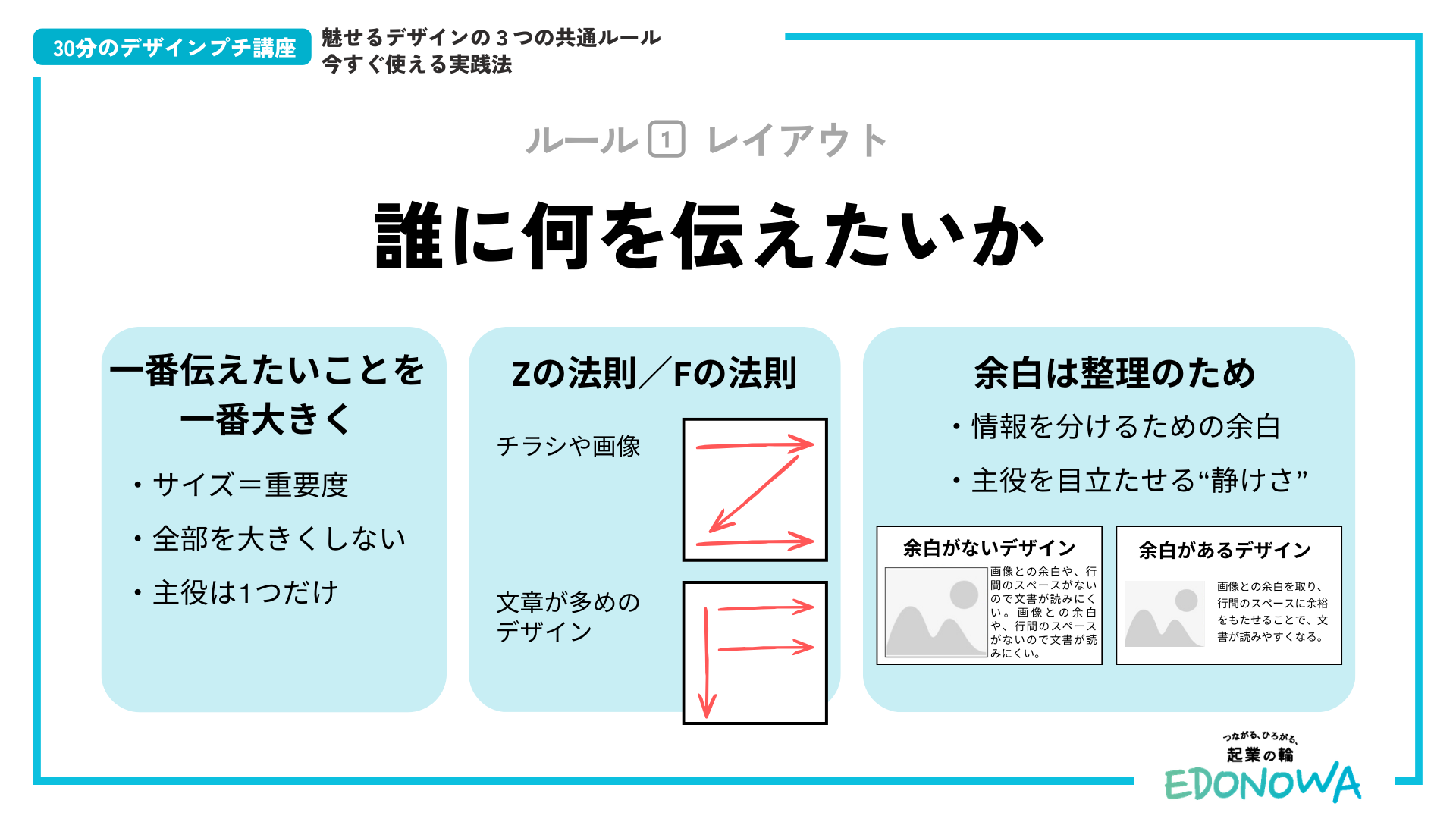 一つ目は「① 情報の優先順位をつける(レイアウト)」であり、二つ目は「② 印象を統一する(色・フォント)」、三つ目は「③ 世界観を統一する(写真・アイコン)」というもの。当日は、事例を交えて3つの共通ルールが解説されました。本レポートでは、そのルールを図解したスライドを特別にご紹介します。デザインに関するYouTubeや書籍などでも様々なノウハウが示されていますが、EDONOWA的にはまずこの3つを押さえると良いでしょう。