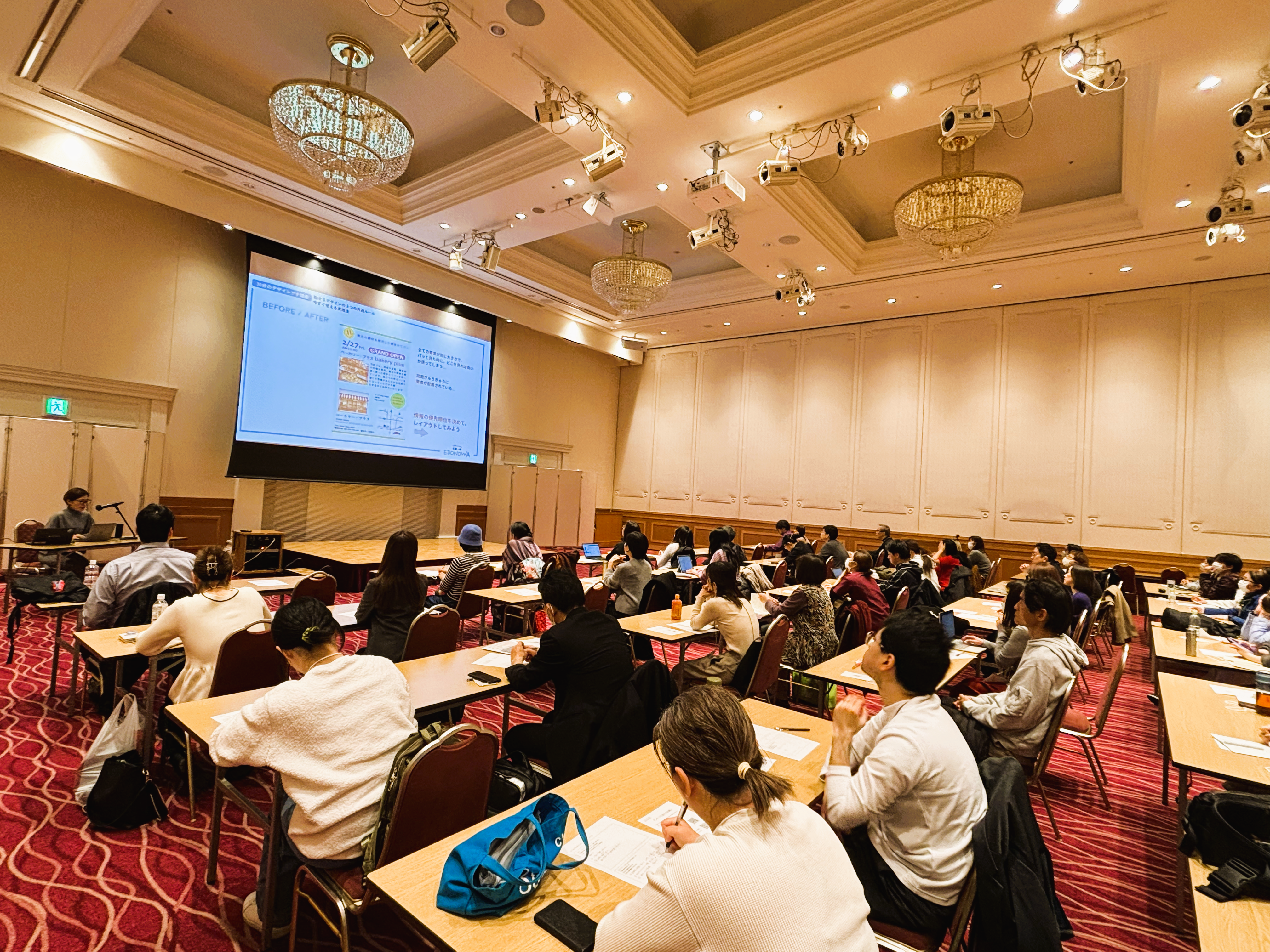 開場とともに座席が埋まっていく様子を見ると、来場者の期待の高さがうかがえました――。2月27日(金)にタワーホール船堀で「魅せ方アップ!デザインのヒントおしゃべり会」を開催しました。本イベントは2部構成で実施され、第1部ではデザインを学べるプチ講座からスタート。「事業のチラシやSNS投稿画像を作ってみたけれど、なんだか伝わらない…」や「自社のサービスの魅力をうまく “ 魅せる ” にはどうすればいい?」といった悩みを持つ皆さんに対して、デザイン制作のコツが実例を交えて説かれました。