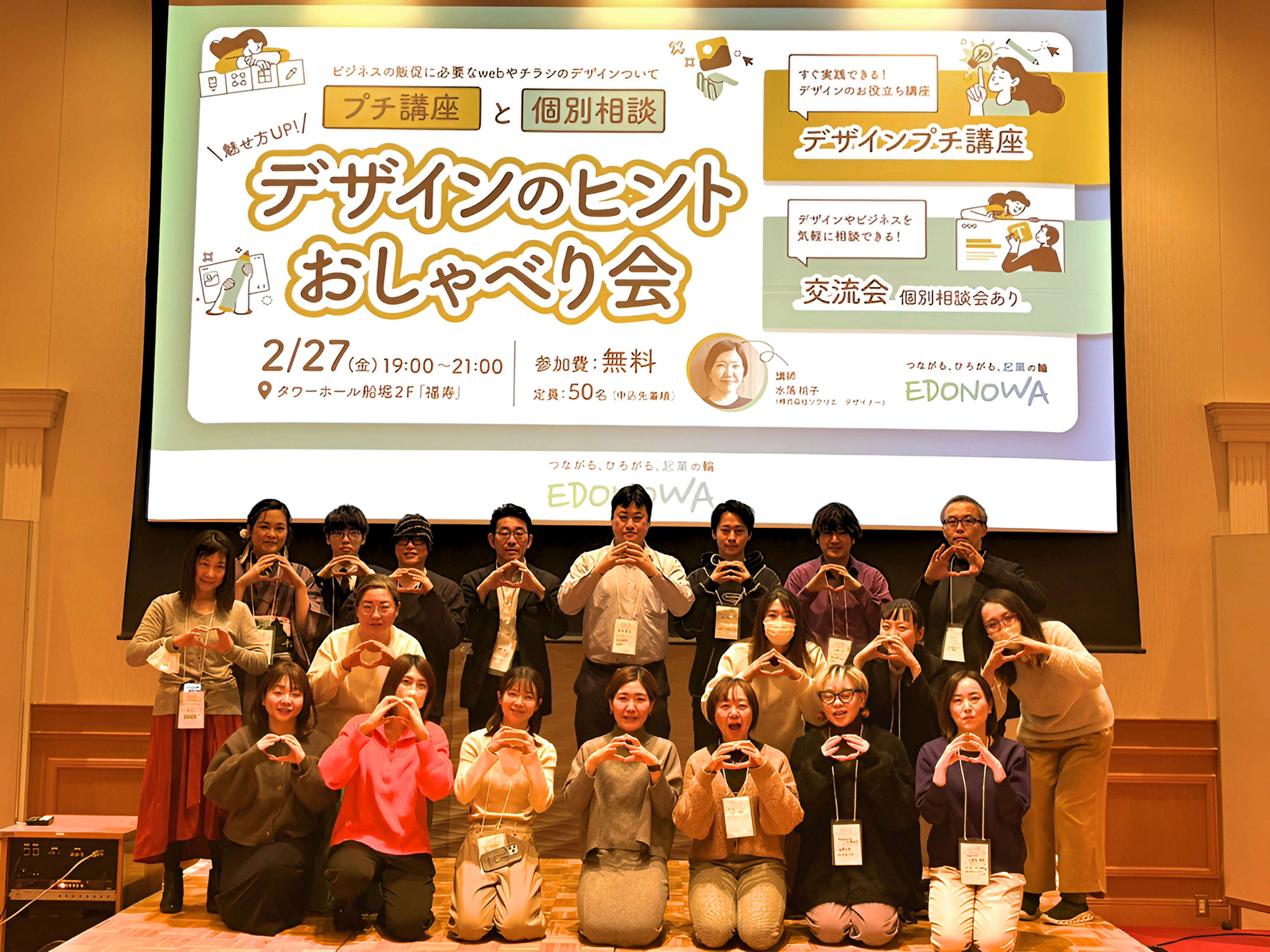 EDONOWAでは、2月27日(金)に「魅せ方アップ!デザインのヒントおしゃべり会」を開催しました。起業をすると尽きない、デザインの悩み。自社の魅力をうまく伝えるには……。本イベントは、そんな課題を持つ方を対象に、チラシやウェブサイトなど事業を進めるにあたって必要なデザインのコツを学び、相談できる機会です。2部構成で行われ、過去最多の参加者が集まった一夜を振り返ります。